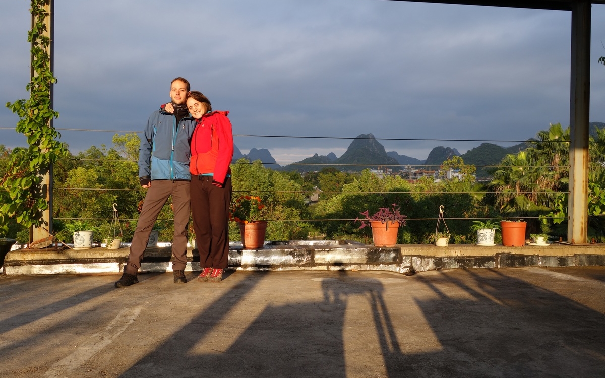 Au petit matin, le taux d’humidité est à son maximum, et les affaires mises à sécher sont encore plus mouillées que la veille. Nous prenons notre petit-déjeuner sur le toit de l’auberge et profitons d’être enfin réellement au milieu des pics caractéristiques de la région.