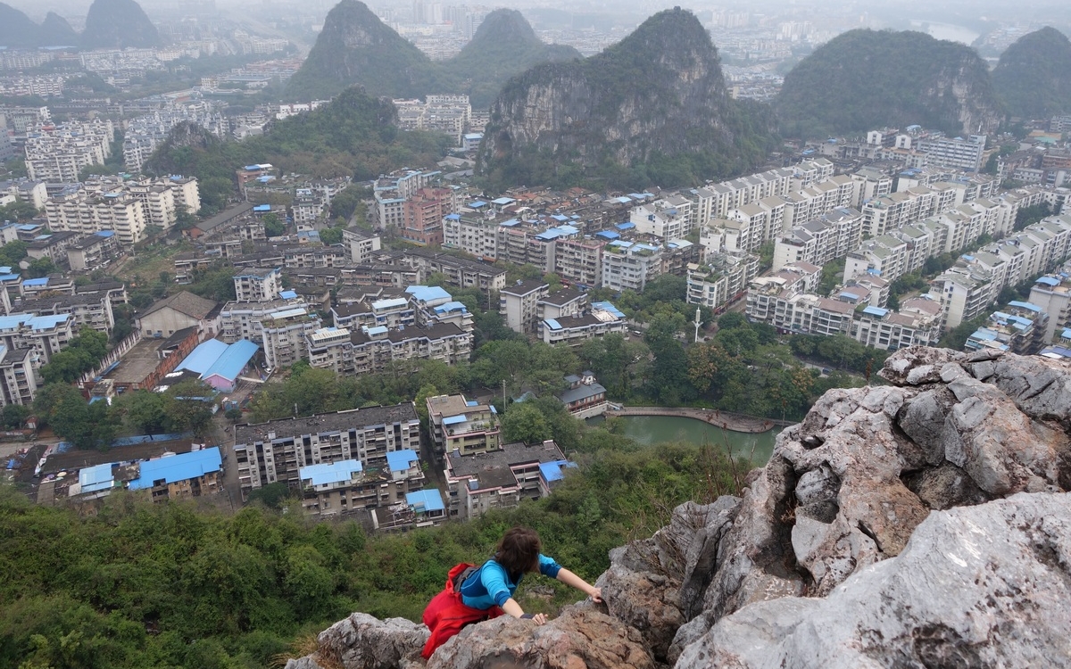 Le lendemain, nous gravissons le seul pic gratuit des abords de la ville. Malgré la grisaille ambiante, le paysage vaut la petite séance de vertige de la fin de la montée. La ville se faufile entre les dunes karstiques jusqu’à perte de vue.